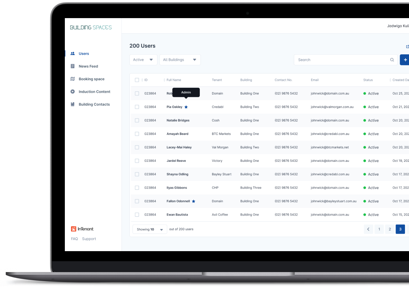Building and facilities managers save precious time in front of the building user directory or access control system. Via our streamlined integrations, onboarding and user administration can be facilitated within the InTenant portal to make light work of onboarding new tenants and their staff, and making changes to those already existing.