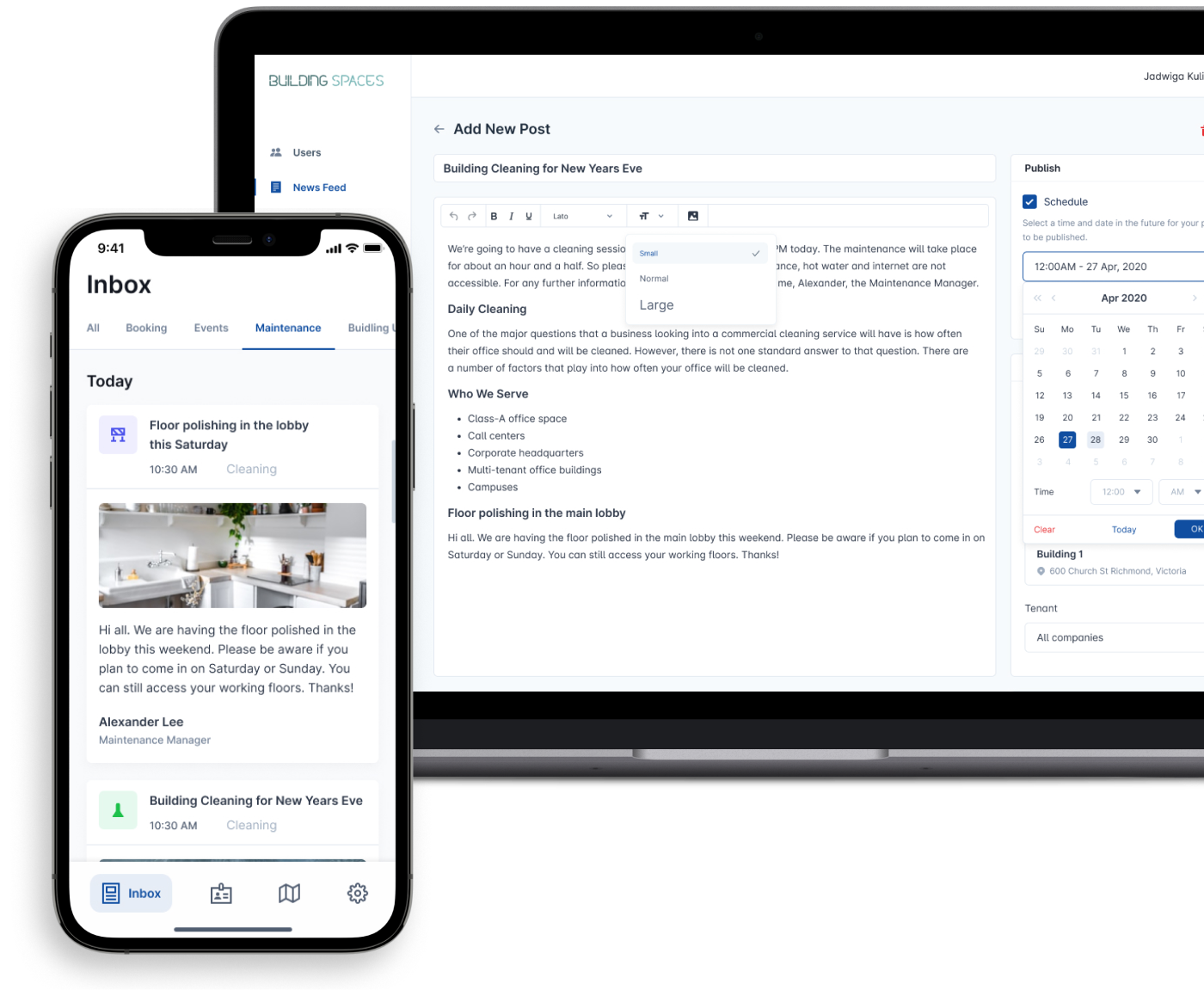 A simple portal that provides administration functions for building managers. A mobile app that allows tenants and residents to easily exist in a building.